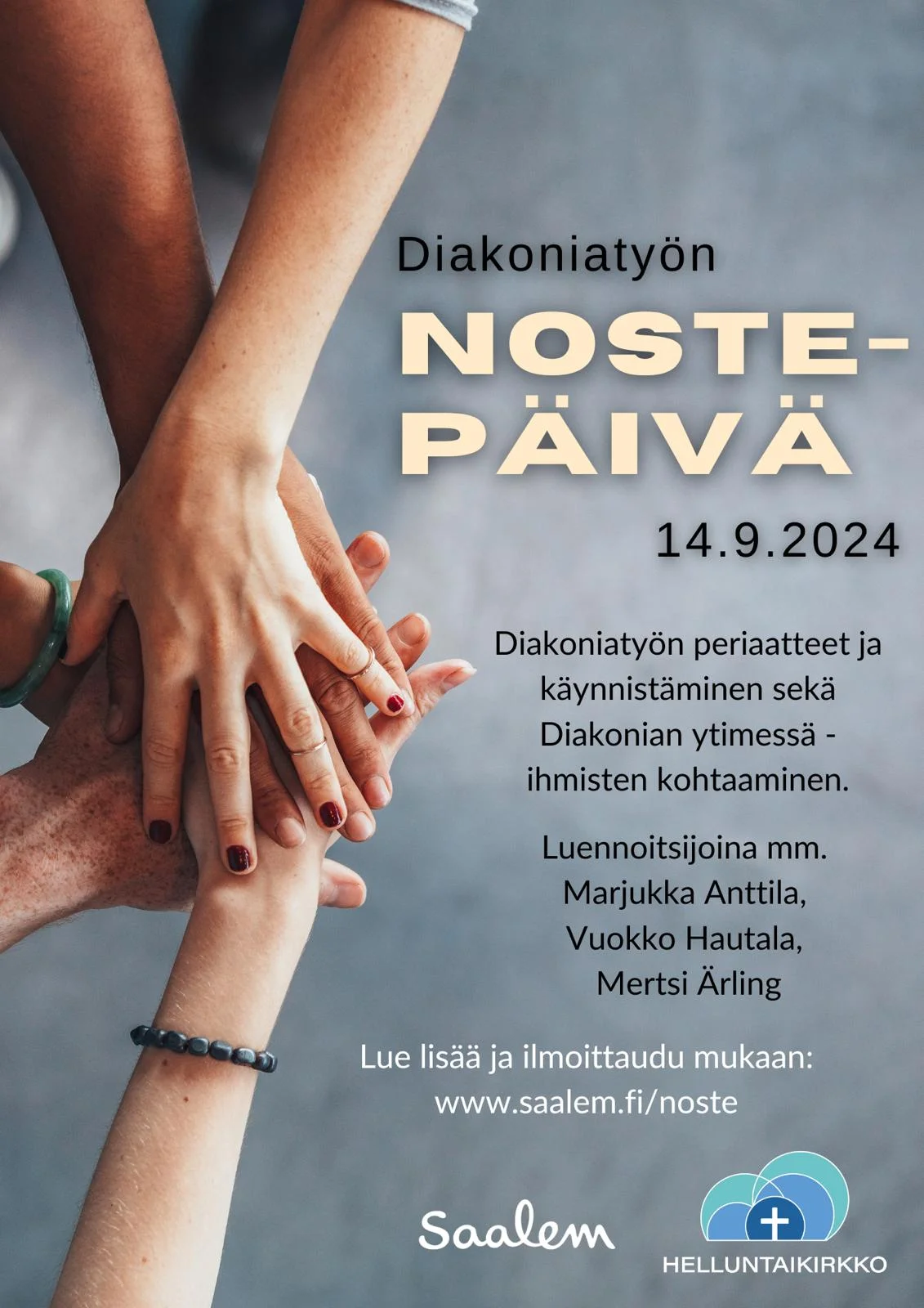 Diakoniatyön Nostepäivä pidetään Helsingin Saalem-seurakunnassa 14.9.2024 klo 8.30–15.30. Päivän järjestävät Suomen Helluntaikirkko ja Helsingin Saalem-seurakunta.