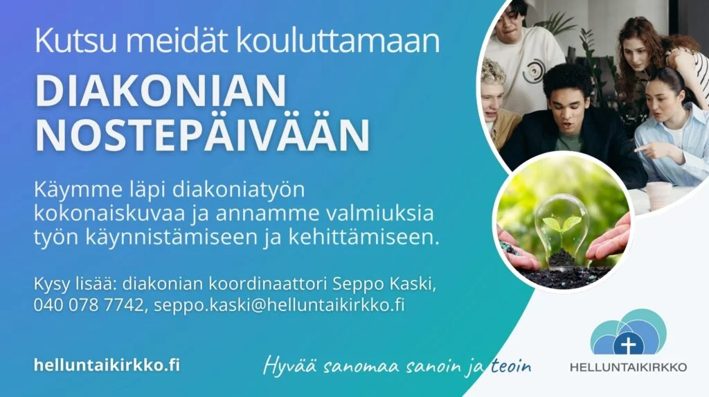 Helluntaikirkko koordinoi helluntaiseurakuntien valtakunnallista diakoniatyötä. Diakonian kehittämistyössä etsitään käytännön tapoja lähimmäisenrakkauden toteuttamiseen. Kehittämistyöryhmän jäsenet osallistuvat aktiivisesti työhön. Lue lisää: https://helluntaikirkko.fi/diakonian-kehittamistyo/.