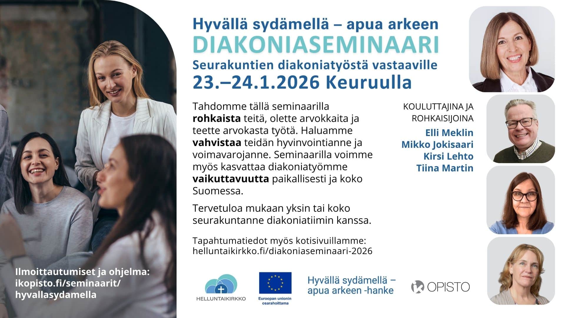 Tahdomme tällä seminaarilla rohkaista teitä, olette arvokkaita ja teette arvokasta työtä. Haluamme vahvistaa teidän hyvinvointianne ja voimavarojanne. Seminaarilla voimme myös kasvattaa diakoniatyömme vaikuttavuutta paikallisesti ja koko Suomessa. Tervetuloa mukaan yksin tai koko seurakuntanne diakoniatiimin kanssa.