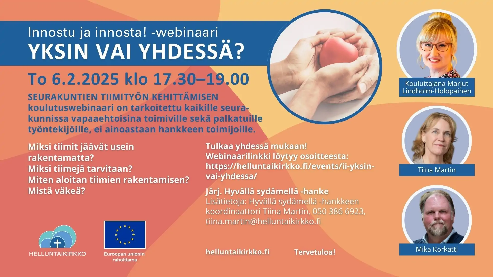 Tämä seurakuntien tiimityön kehittämisen koulutuswebinaari on tarkoitettu kaikille seurakunnissa vapaaehtoisina toimiville sekä palkatuille työntekijöille.