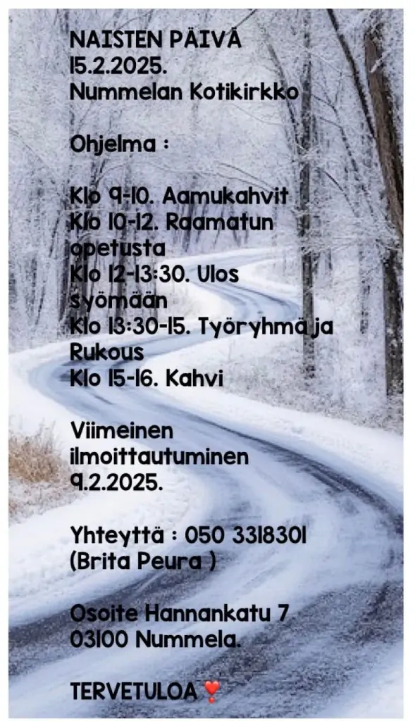 Naisten päivä 15.2.2025 klo 9.00–16.00 Nummelan Kotikirkossa