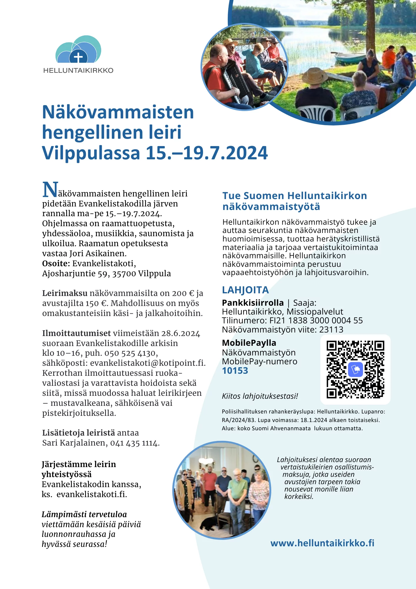 Näkövammaisten hengellinen leiri pidetään Evankelistakodilla Vilppulassa järven rannalla ma-pe 15.–19.7.2024. Ohjelmassa on raamattuopetusta, yhdessäoloa, musiikkia, saunomista ja ulkoilua. Raamatun opetuksesta vastaa Jori Asikainen.