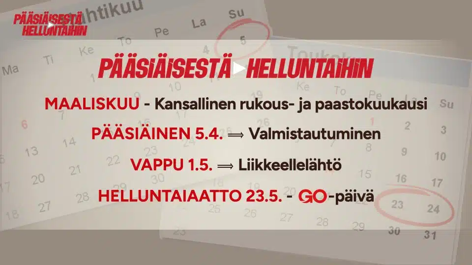 Erityinen kampanjan rukouskuukausi on 1.–31.3.2026. Kutsumme sinua rukoilemaan ja mahdollisuuksien mukaan myös paastoamaan ihmisten tavoittamisen ja kristittyjen liikkeellelähdön puolesta Kristuksen todistajina. Pyydämme, että voisit myös jakaa videotervehdyksiä ja innostaa tuttujasi rukoilemaan ja harkitsemaan mukaantuloa kertomaan Jeesuksesta jollekulle tänä keväänä.