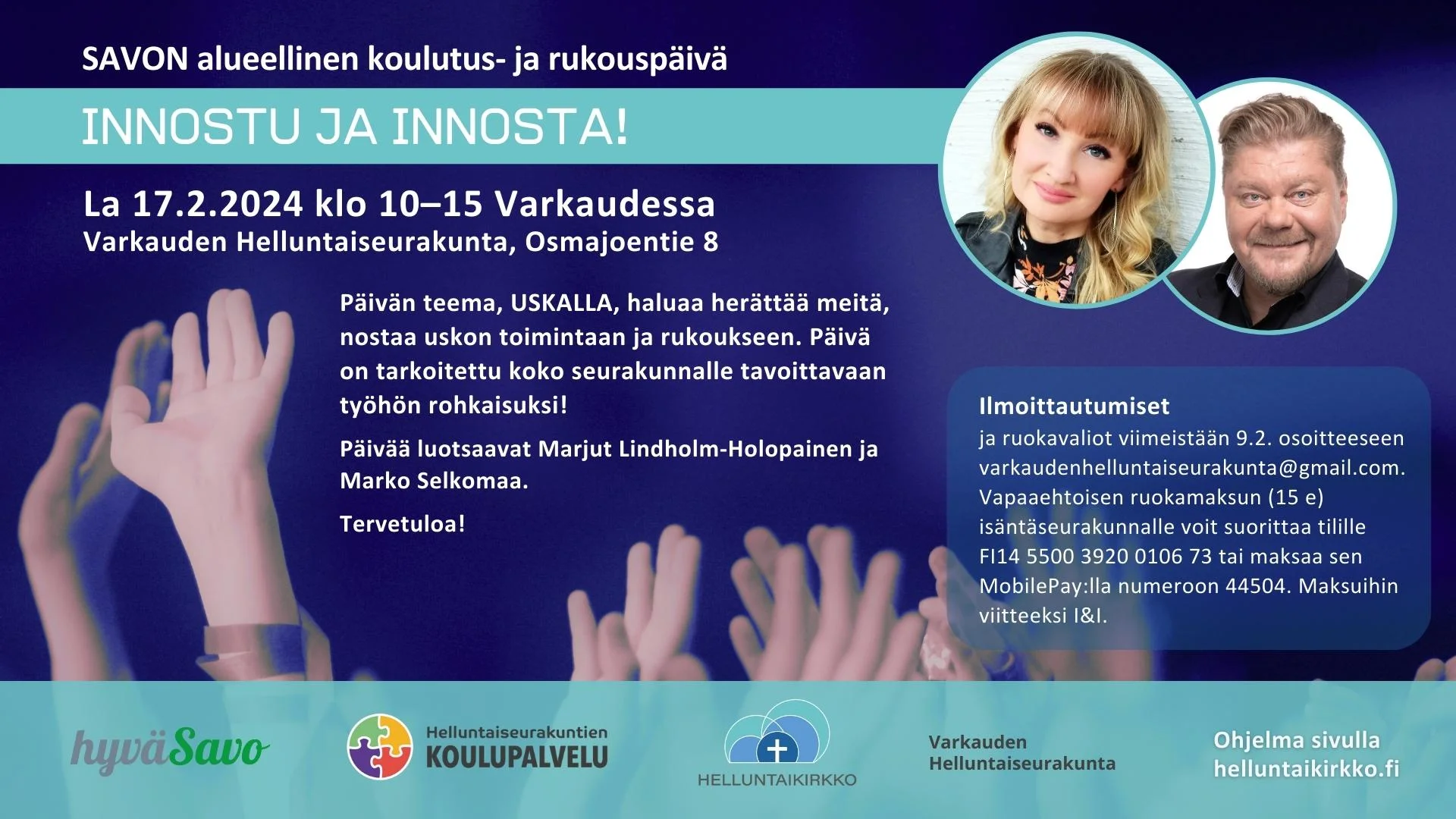 Savon alueellisen Innostu ja innosta -koulutus- ja rukouspäivän teema, USKALLA, haluaa herättää meitä, nostaa uskon toimintaan ja rukoukseen. Päivä on tarkoitettu koko seurakunnalle tavoittavaan työhön rohkaisuksi!