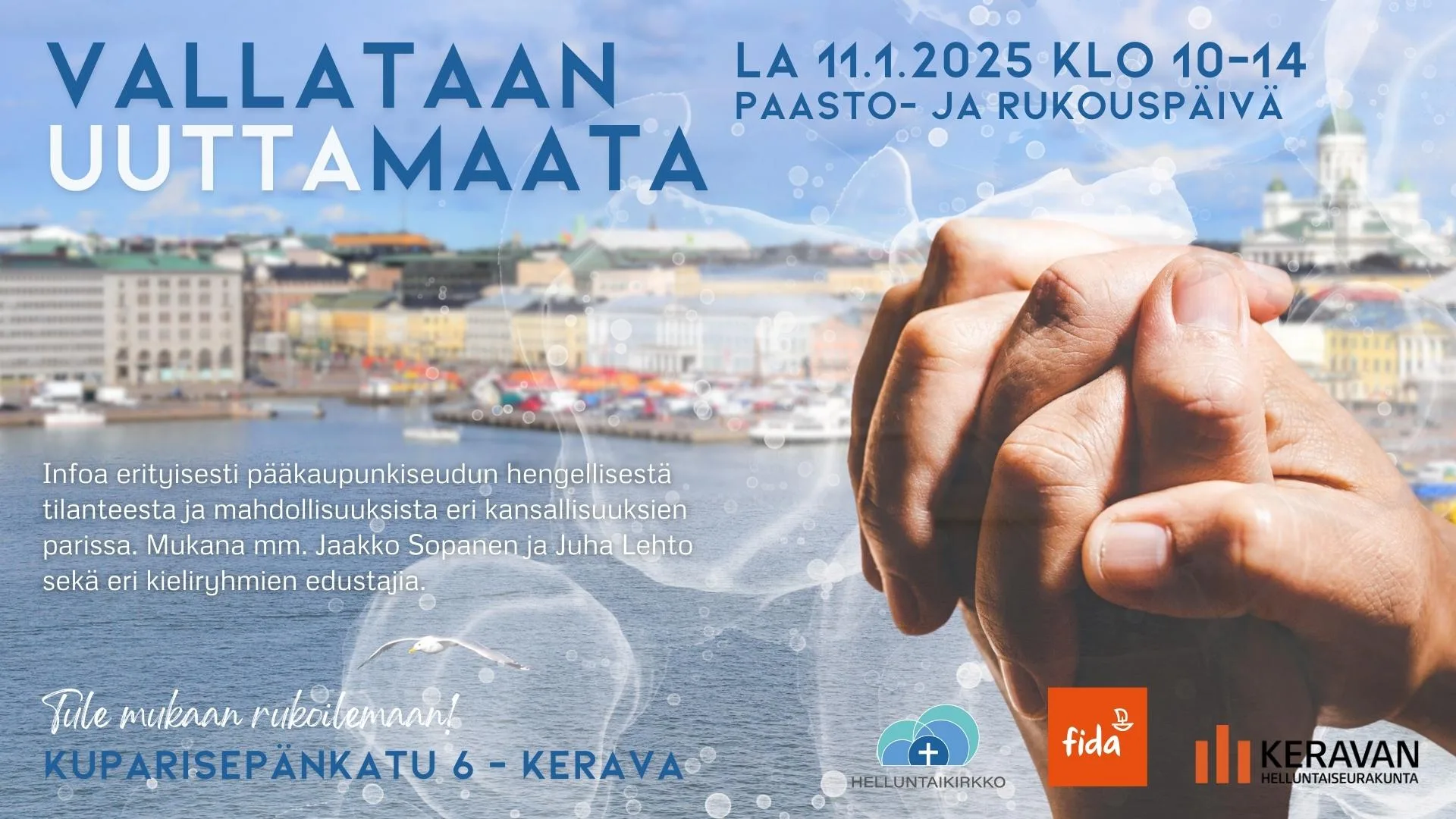 Kuulet infoa erityisesti pääkaupunkiseudun hengellisestä tilanteesta ja mahdollisuuksista eri kansallisuuksien parissa. Rukous- ja paastopäivä Vallataan Uuttamaata lauantaina 11.1.2025 klo 10–14 pidetään Keravan Helluntaiseurakunnalla, Kuparisepänkatu 6:ssa. Mukana ovat muun muassa Jaakko Sopanen ja Juha Lehto sekä eri kieliryhmien edustajia.
