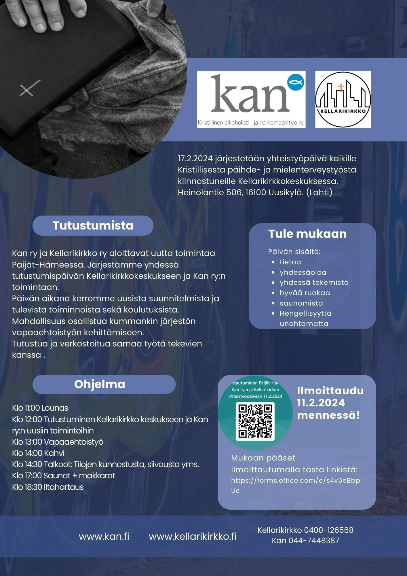 Kan ry ja Kellarikirkko ry aloittavat uutta toimintaa Päijät-Hämeessä. Päivän aikana jaetaan tietoa uusista suunnitelmista ja tulevista toiminnoista sekä koulutuksista. Mahdollisuus on osallistua kummankin järjestön vapaaehtoistyön kehittämiseen. Päivässä voi tutustua ja verkostoitua samaa työtä tekevien kanssa.