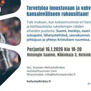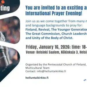 You are invited to an exciting and powerful International Prayer Evening! Join us as we come together from many nations and language backgrounds to pray for: Finland, Revival, The Younger Generation, The Great Commission, Church Leadership and Unity of the Body of Christ. Date: Friday, January 16, 2026; time: 18–20 Venue: Helsinki Saalem, Näkinkuja 3, […]