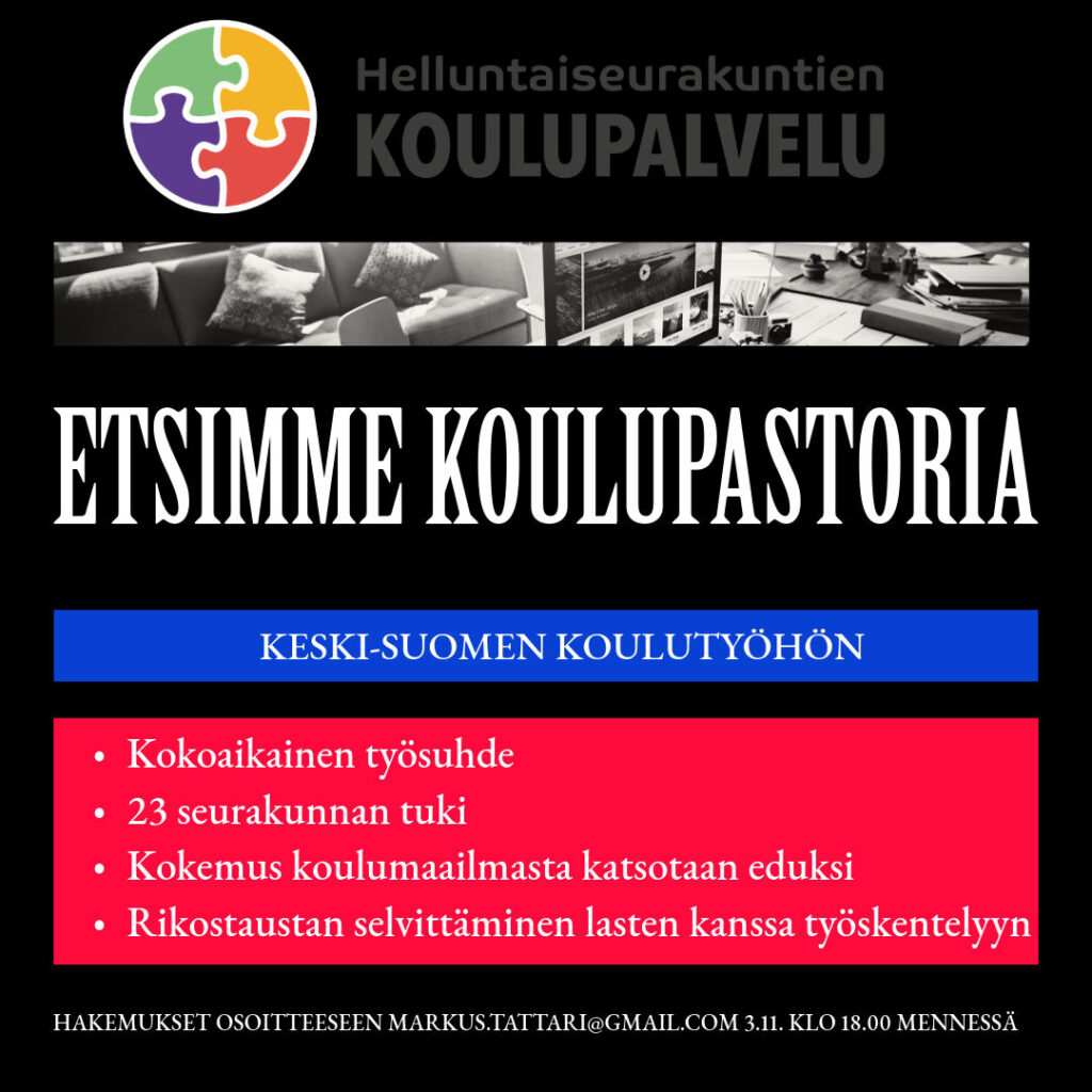 Olet etsimämme henkilö, jos sinulla on näky ja kokemusta lasten -ja nuorten kanssa työskentelystä, olet organisointikykyinen ja yhteyksien luominen kouluhenkilökunnan sekä seurakuntien kanssa on sinulle luontevaa. Oma auto on edellytys tehtävän hoitamiseen. Rikostaustaote alaikäisten kanssa työskentelystä johtuen on esitettävä ennen tehtävän vastaanottamista.