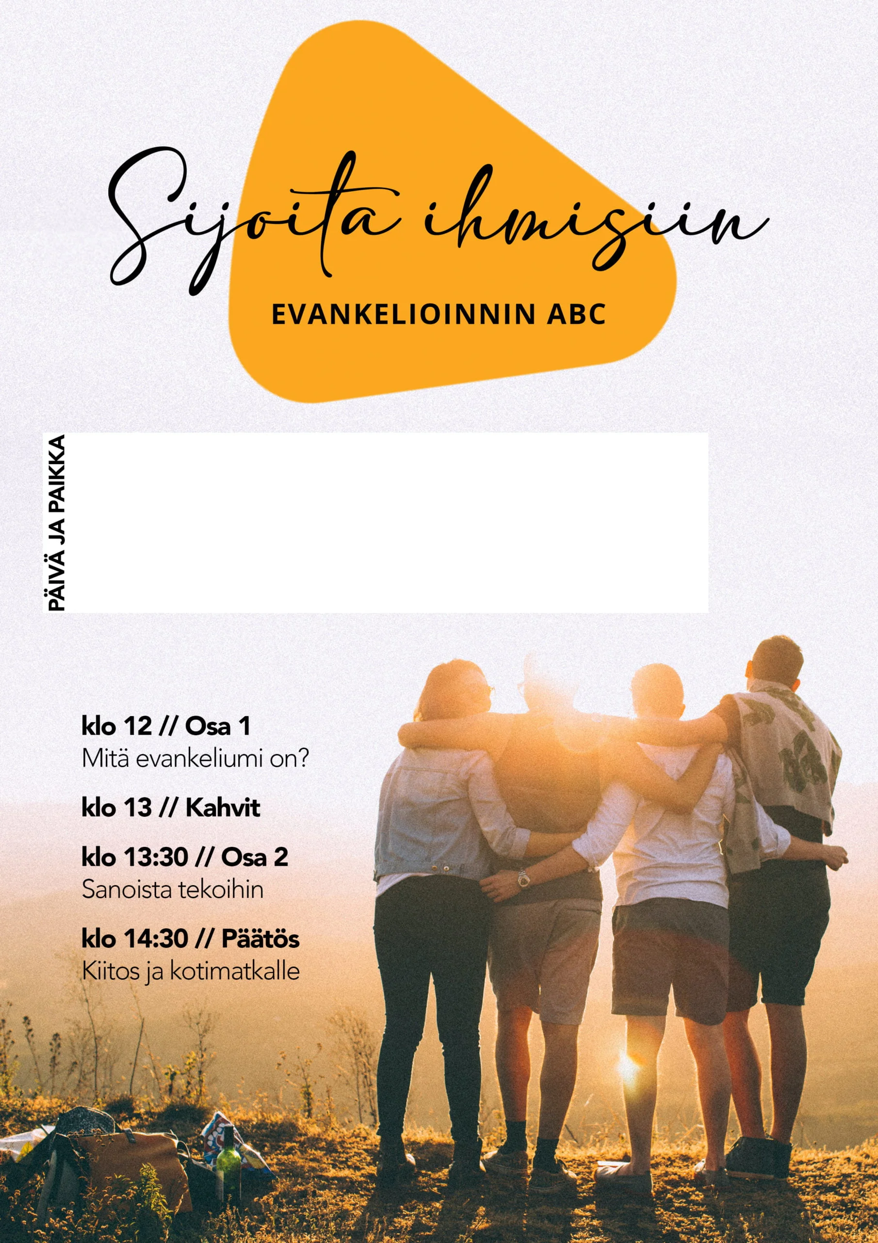 Toivoisitko ”Sijoita Ihmisiin – Evankelioinnin ABC” -päivää seurakuntaasi? Ota yhteyttä sähköpostitse osoitteeseen hs-palvelut@helluntaikirkko.fi tai soita 050 441 0990.