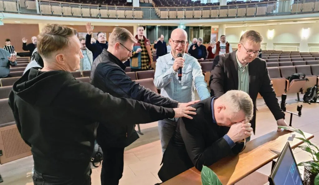 Kauko Uusila siunattiin yhdessä heti valintapäätöksen jälkeen tehtäväänsä. Siunausrukoukseen johdatti Keuruun helluntaiseurakunnan pastori Kenneth Karppinen. Kuva: Janne Lahti.