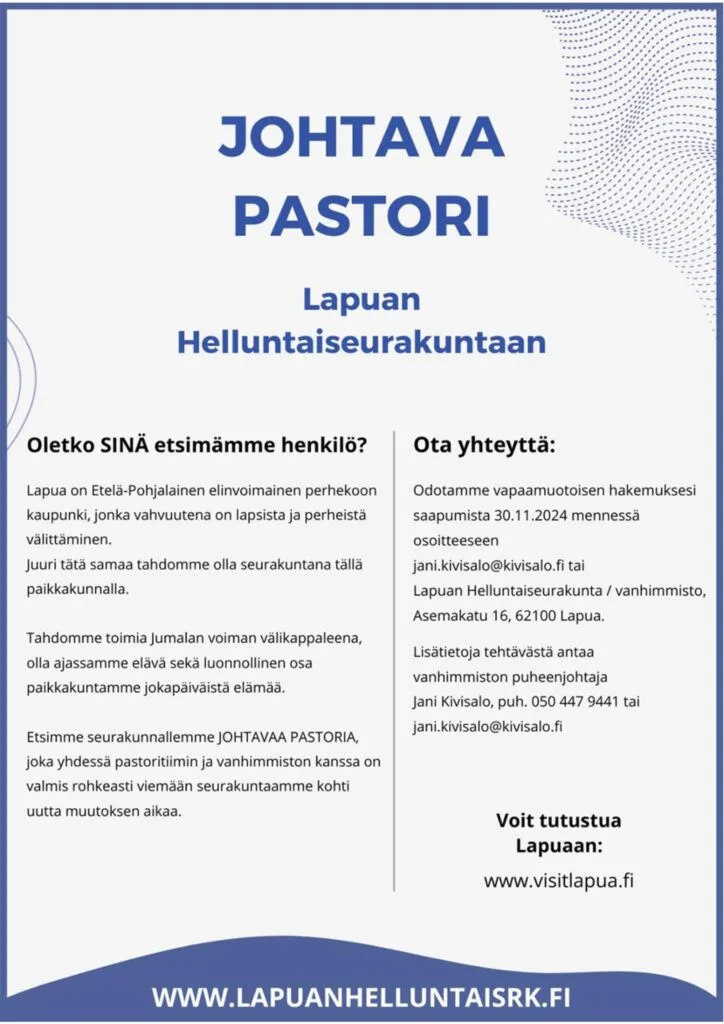 Lapuan Helluntaiseurakunta on avannut johtavan pastorin rekrytoinnin. Oletko SINÄ etsimämme henkilö? Lapua on Etelä-Pohjalainen elinvoimainen perhekoon kaupunki, jonka vahvuutena on lapsista ja perheistä välittäminen. Juuri tätä samaa tahdomme olla seurakuntana...