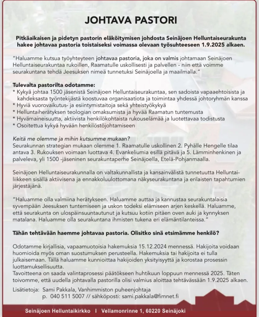 Pitkäaikaisen ja pidetyn pastorin eläköitymisen johdosta Seinäjoen Helluntaiseurakunta hakee johtavaa pastoria toistaiseksi voimassa olevaan työsuhteeseen 1.9.2025 alkaen. ”Haluamme kutsua työyhteyteen johtavaa pastoria, joka on valmis johtamaan Seinäjoen...
